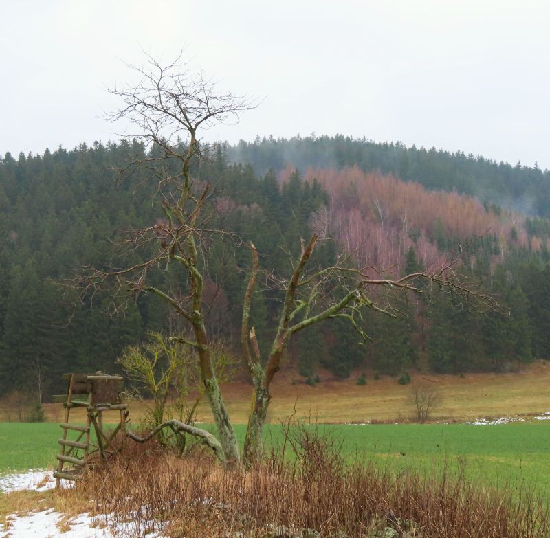 Die Feldflur nördlich von Nassau (Gemeindeteil von Frauenstein) ist relativ arm an großen markanten Bäumen. An sich kein Ort, um nach potenziellen Baumdenkmalen zu suchen – aber diese Eberesche wurde bereits 2019 von Prof. Roloff (Tharandt) gefunden, nach einer längeren Erkundung von Frauenstein nach Südosten [2]. Der Zugang von Nassau ist landschaftlich weniger reizvoll, aber deutlich kürzer: Nordöstlich der Landstraße 171 einem Feldweg, an der Mehrzweckscheune vorbei, folgen. Das Gelände steigt hier merklich an, fällt aber hinter einer Anhöhe deutlich zur Niederung der Gimlitz hin ab. Der feste Weg ist hier kaum noch erkennbar; wohl aber diese Eberesche inmitten einer Wiesenfläche, auf einer kleinen Erhebung.