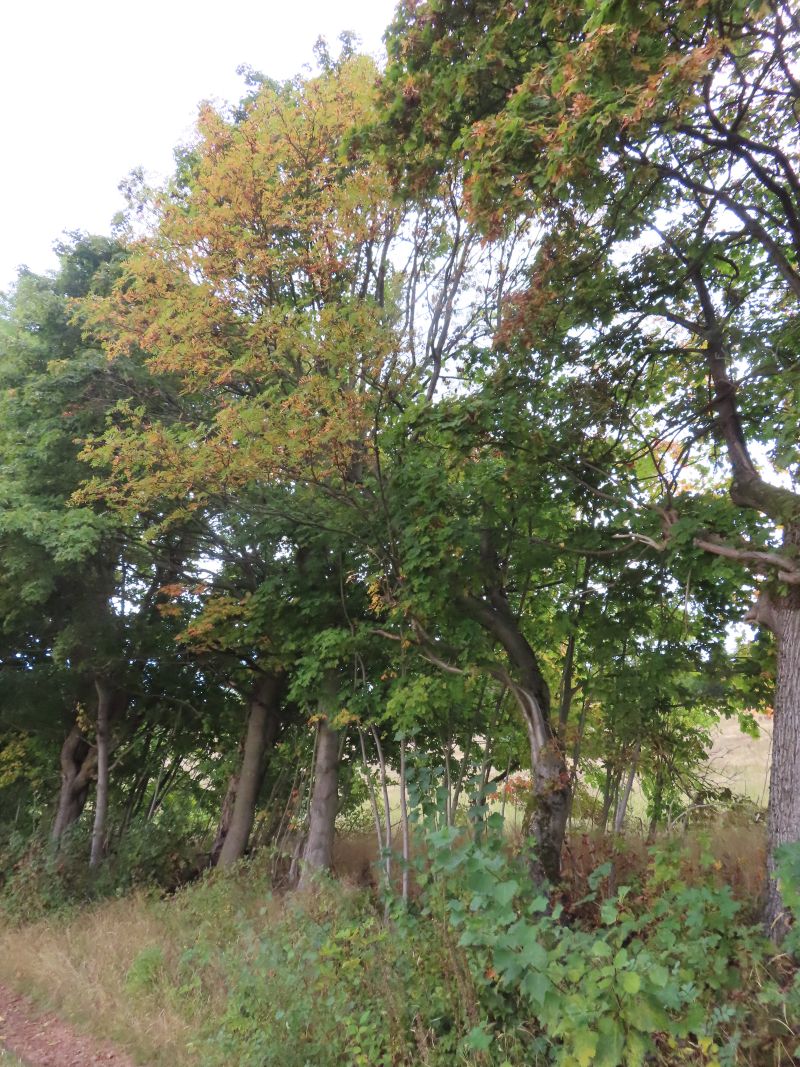 Ein Besuch in Kipsdorf lohnt sich schon hinsichtlich der mächtigen Esche in Oberkipsdorf und der als Naturdenkmal geschützten Feld-Ulme. Auch gelangt man von hier gut zu Fuß zum wohl größten alten Tannenbestand des Osterzgebirges an den Pöbeltalhängen. Auf dem Weg dorthin, etwas versteckt in einer Reihe älterer Spitz-Ahorne, steht die derzeit (offiziell) drittgrößte Eberesche Sachsens [1]. Mit gekrümmtem Stamm und bedrängt von den Nachbarbäumen wirkt sie noch vergleichsweise vital, und hat gegenüber der Ersterfassung von 2015 (damals 1,1 m Umfang und 8 m Höhe) [2] noch einmal deutlich zugelegt. Im Herbst (2025) brachen jedoch einige Pilzfruchtkörper aus dem Stamm heraus. Andererseits ist der Stamm aber auch recht üppig mit Moosen und Flechten bewachsen.